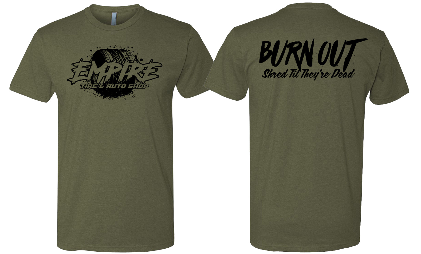 The Empire Tires and Auto Shop, BURNOUT shirt is on the classic military green comfort blend tshirt. What better way to express your joy for the dual black lines left behind on a good burnout! Shred Till They're Dead, is what we say when going all out at burnout competitions.